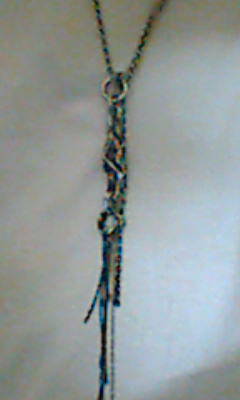 一本のひも状に長ーくなっているものを、シルバーの飾りっぽいごつい部分の輪っかに通してくるっと丸めて首に巻く感じ。