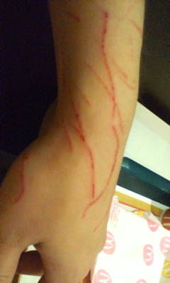 裏側にももちろん同じような傷があって、指には噛まれた傷があります。